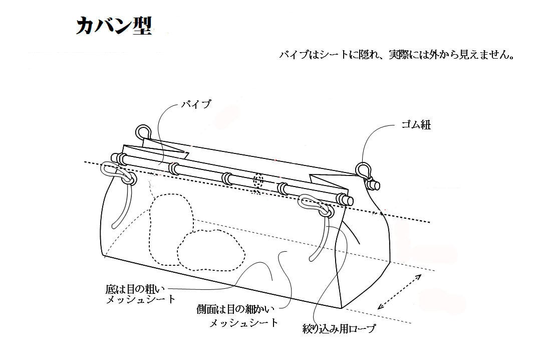口の部分にアルミパイプが入れてあり、2本のパイプを寄せ合わせることで口を閉じます。